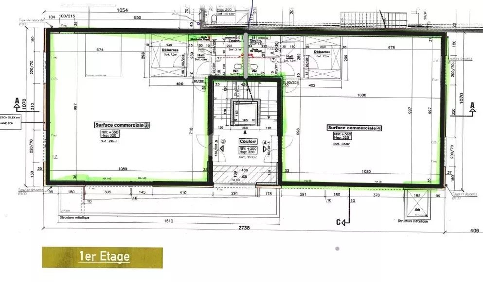 2 locaux commerciaux au 1er étage (99 m² chacun)