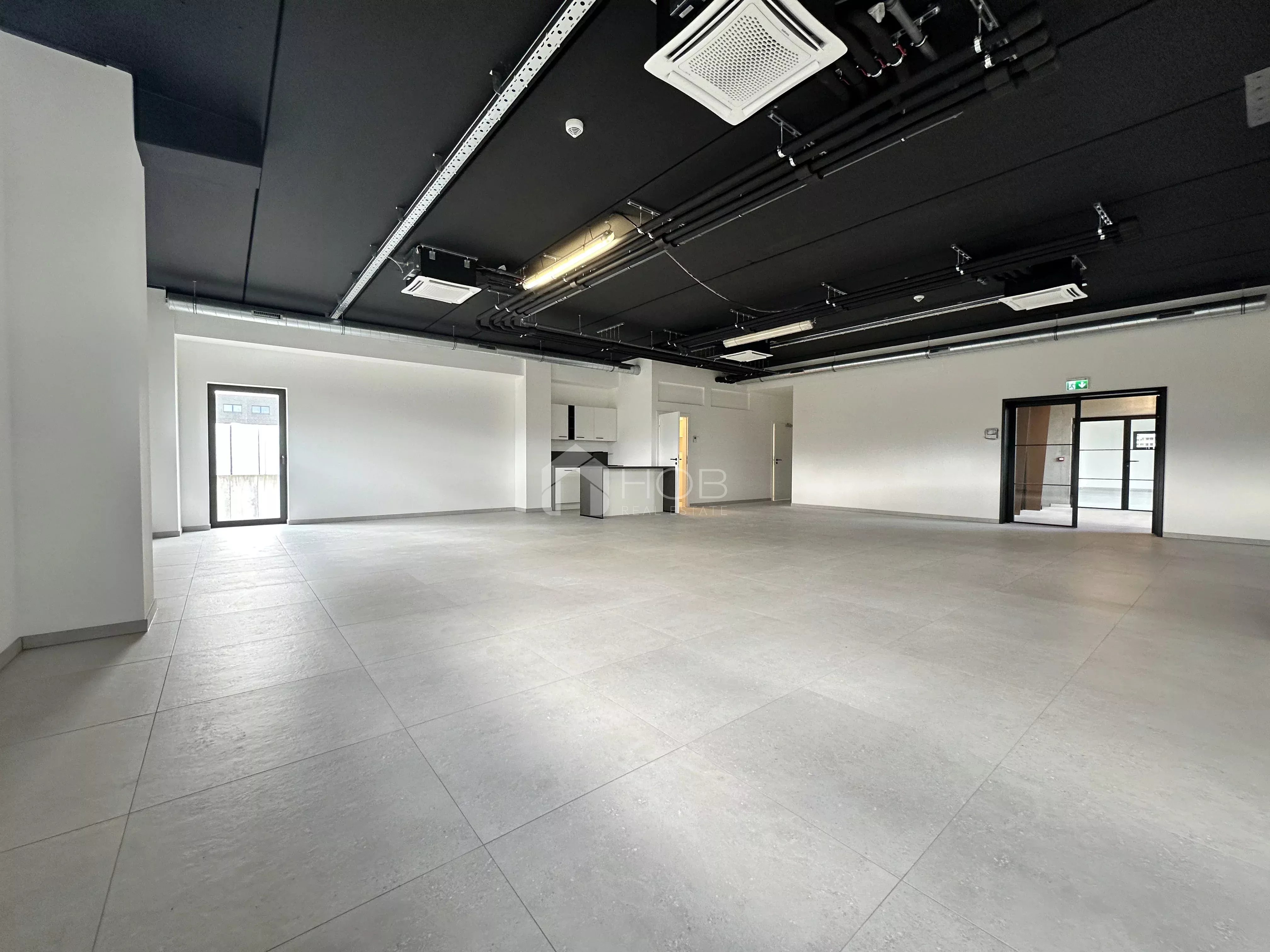 Les deux locaux situés à l’étage peuvent être loués séparément ou réunis en un seul grand local de 198 m² en supprimant une cloison.