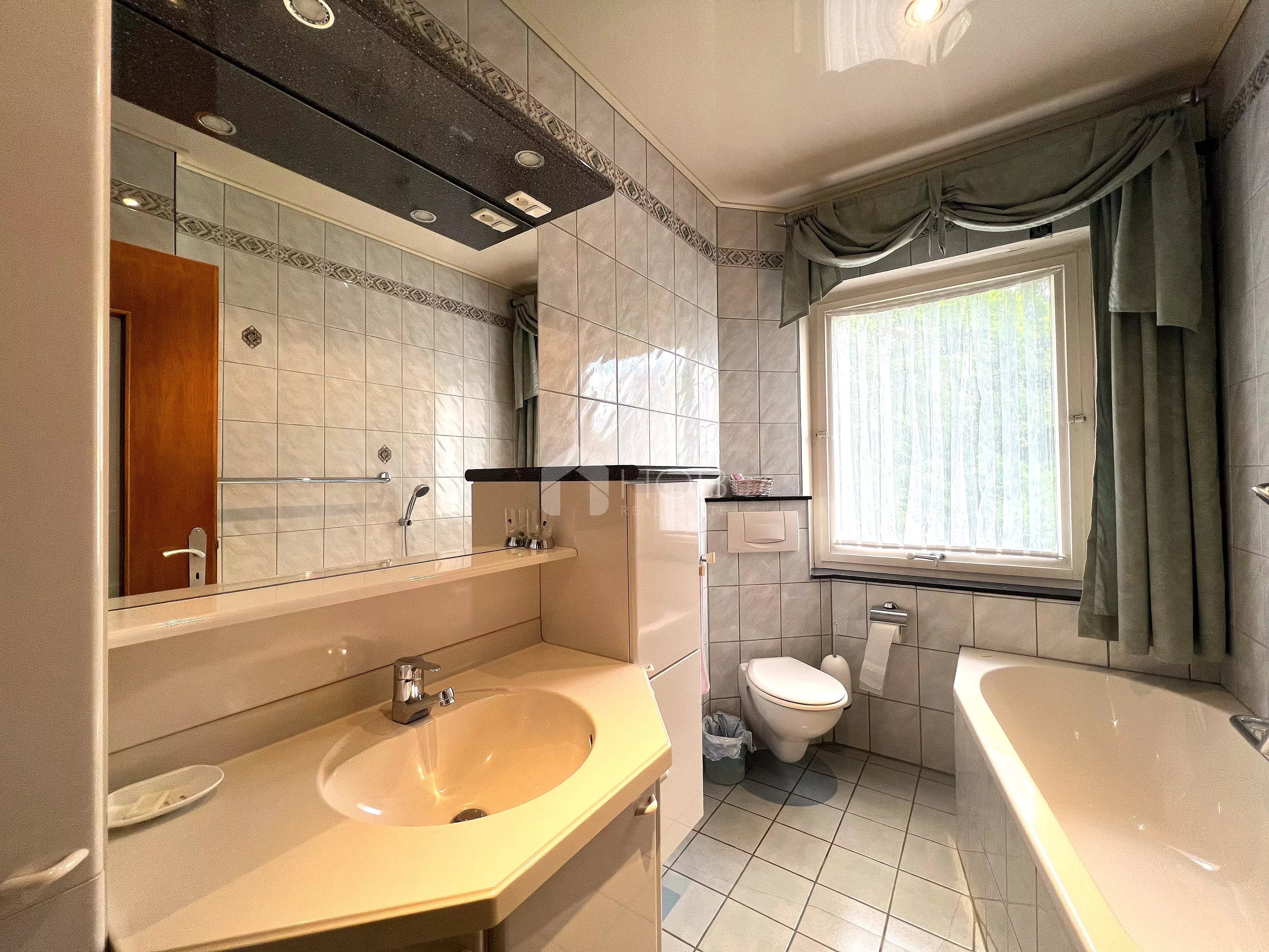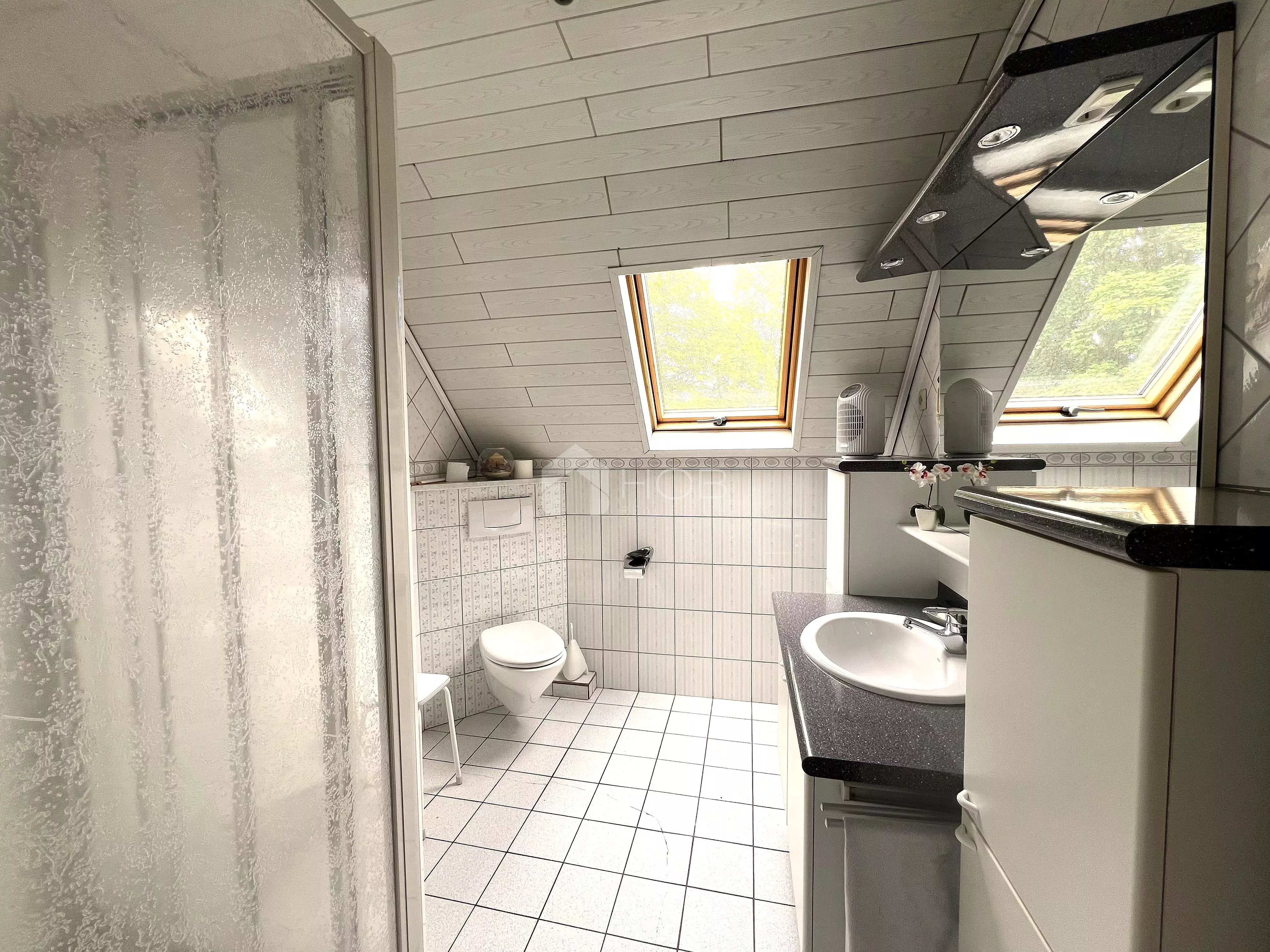 La maison se trouve sur un terrain spacieux – idéal pour tous ceux qui apprécient la nature et l’intimité, mais qui ne veulent pas pour autant manquer la proximité des écoles, des commerces et des voies de communication.