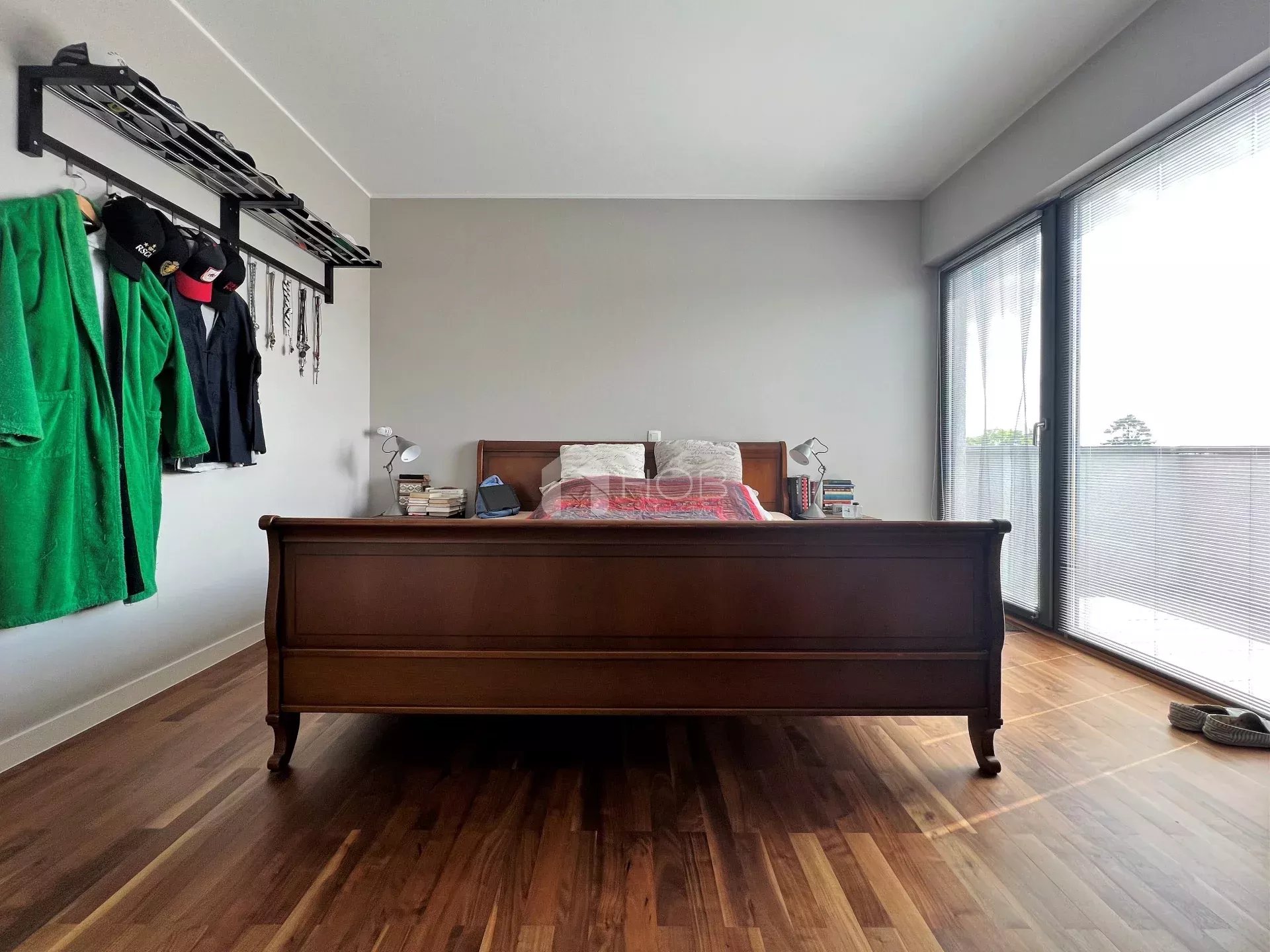 • Au rez-de-chaussée : hall d’entrée (9,45 m²) – chambre à coucher (16,23 m²) avec balcon (6,32 m²) – living (30,85 m²)