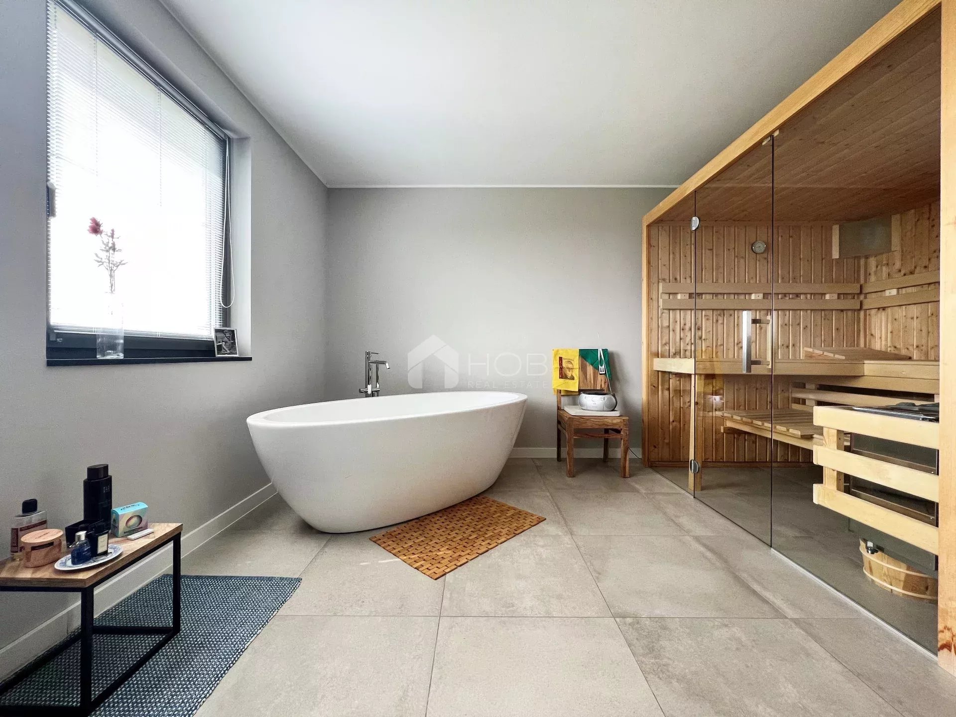 • Au 1er étage : hall (8,12 m²) – salle de bains avec douche (7,28 m²) – chambre polyvalente avec baignoire et sauna (20,33 m²) – chambre à coucher (15,20 m²)