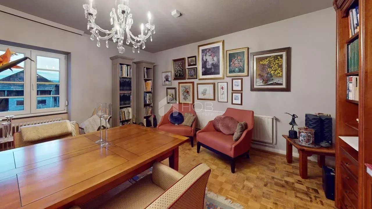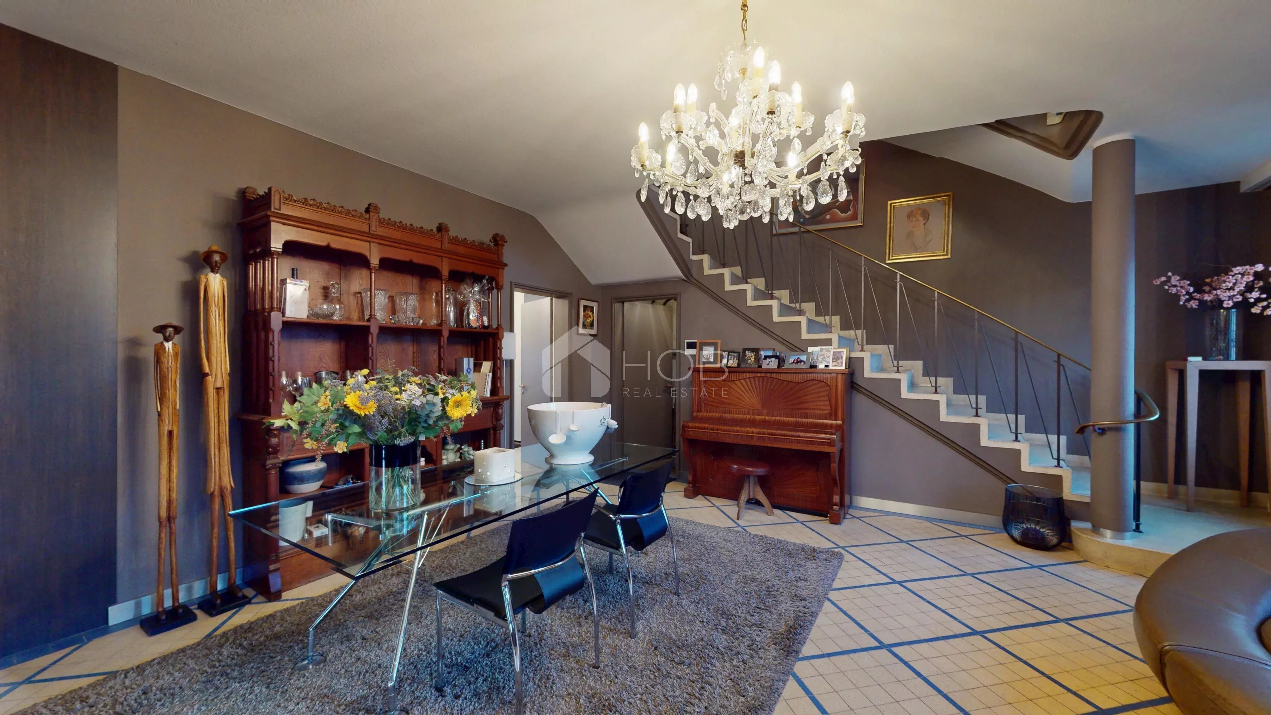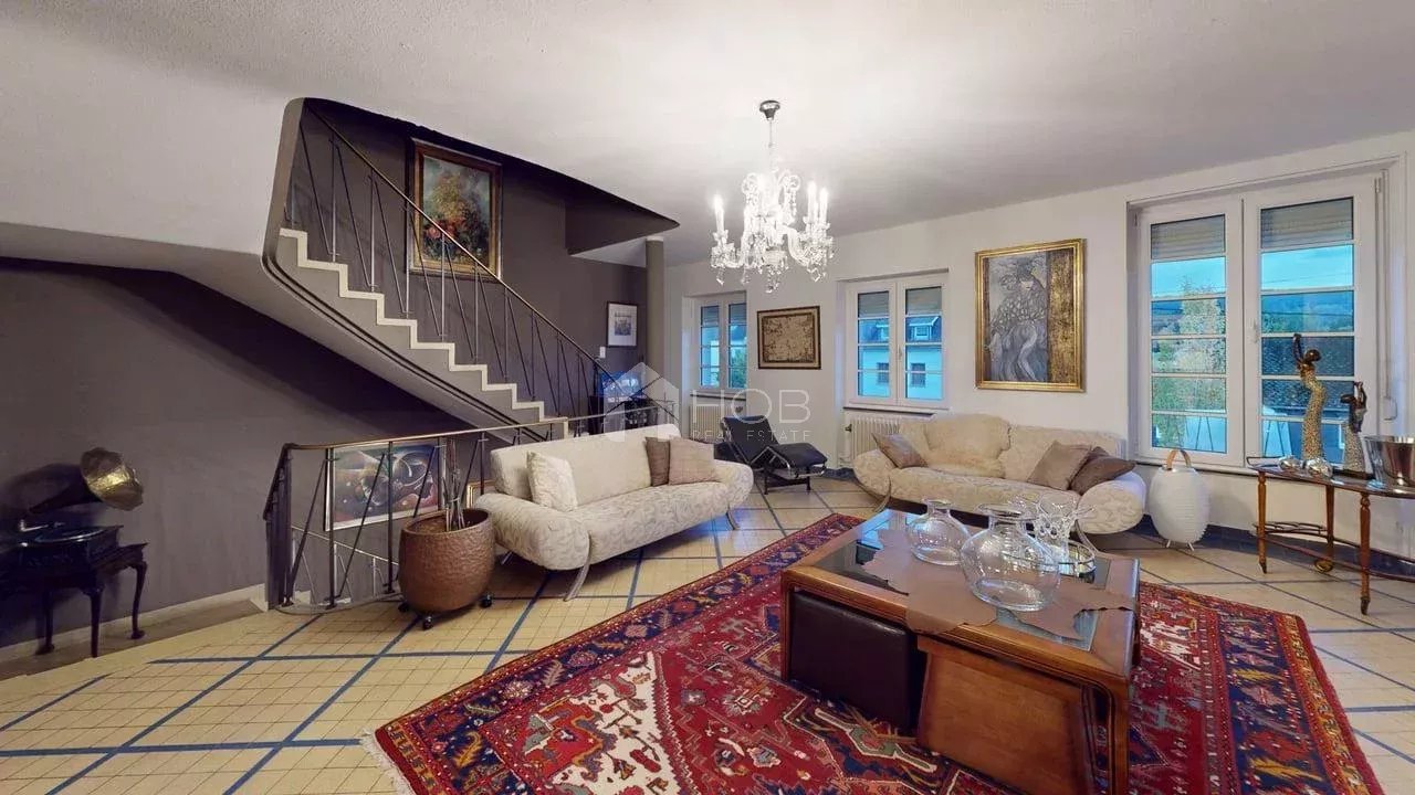 Bij binnenkomst maakt de lichte, uitnodigende entree met stijlvolle tegelvloeren, die harmonieus doorlopen in de echte houten parketvloeren van de woonkamers en slaapkamers, meteen indruk. Moderne houten en glazen deuren, hoogwaardige materialen en een stijlvolle combinatie van traditie en eigentijds design geven elke kamer een bijzondere sfeer.